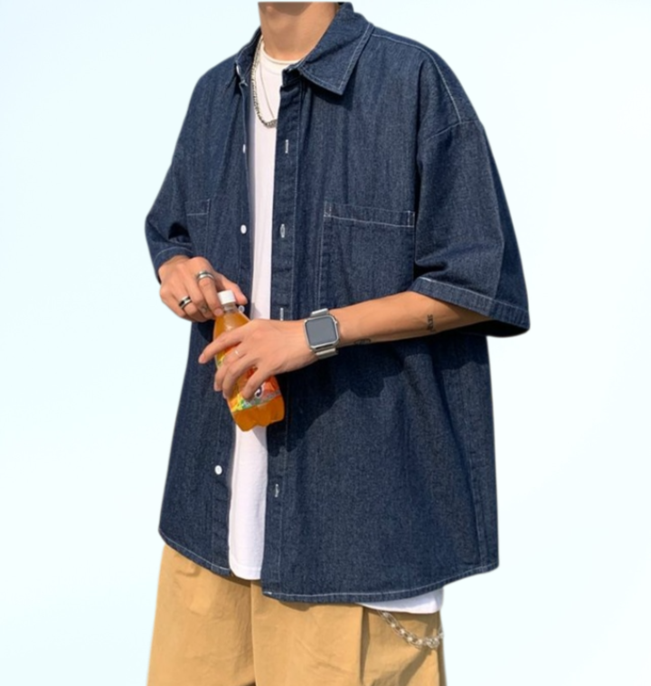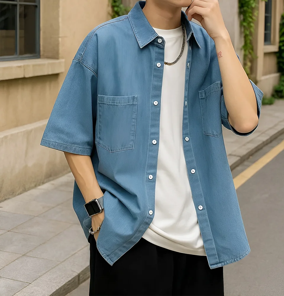 เสื้อเชิ้ตยีนส์แขนสั้นสไตล์เกาหลีสำหรับผู้ชาย เทรนด์ฤดูร้อน สำหรับวัยรุ่น