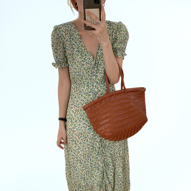 เดรสสไตล์ฝรั่งเศส คอวี กระดุมแถวเดียว ดีไซน์เรียบหรู ผ้าระบายอากาศ ยาวปานกลาง เหมาะกับฤดูร้อน แมทช์ง่ายทุกโอกาส