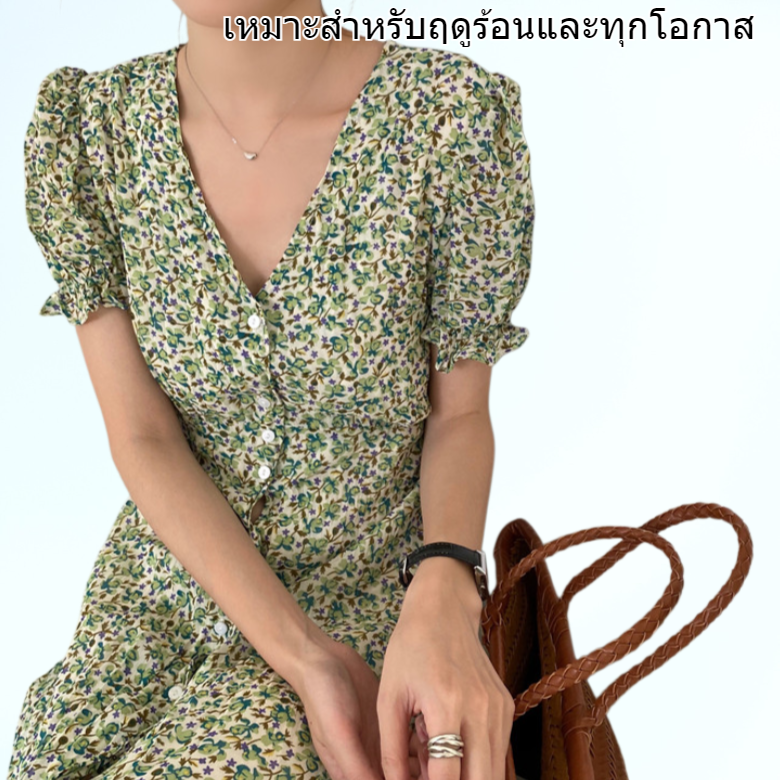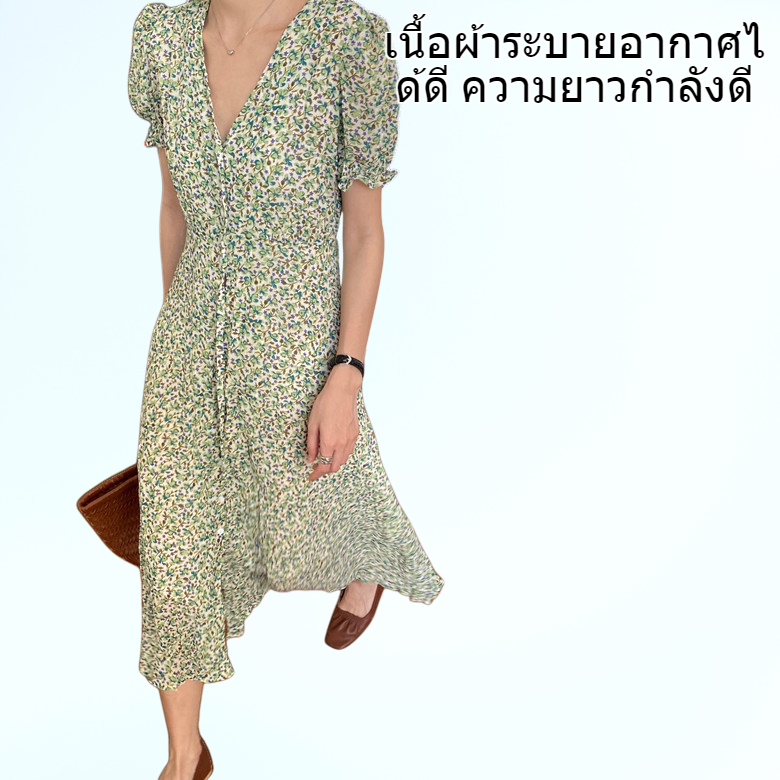 ชุดเดรสสไตล์ฝรั่งเศสโรแมนติกคอวีกระดุมแถวเดียวยาวปานกลางช่วงฤดูร้อน